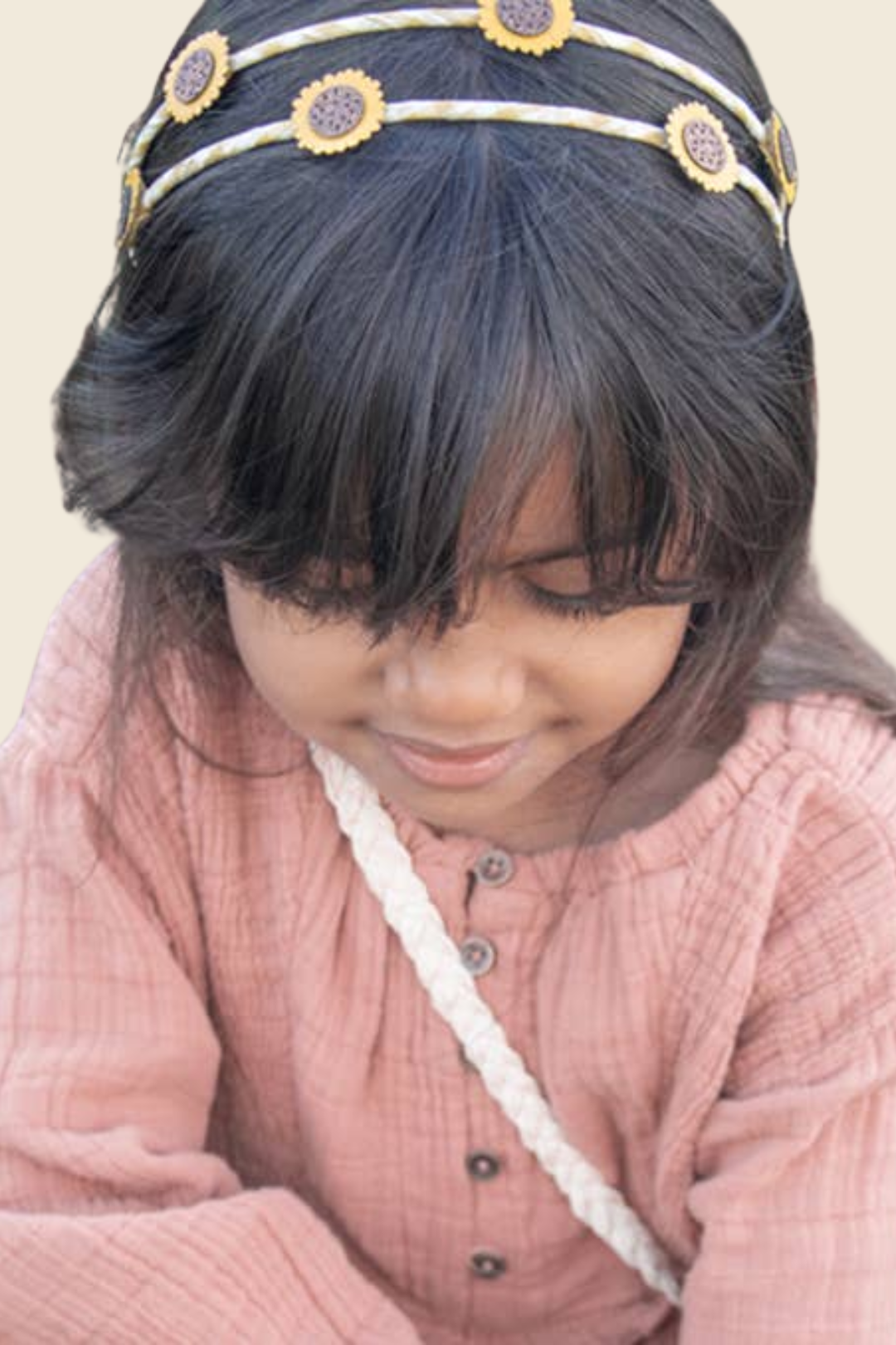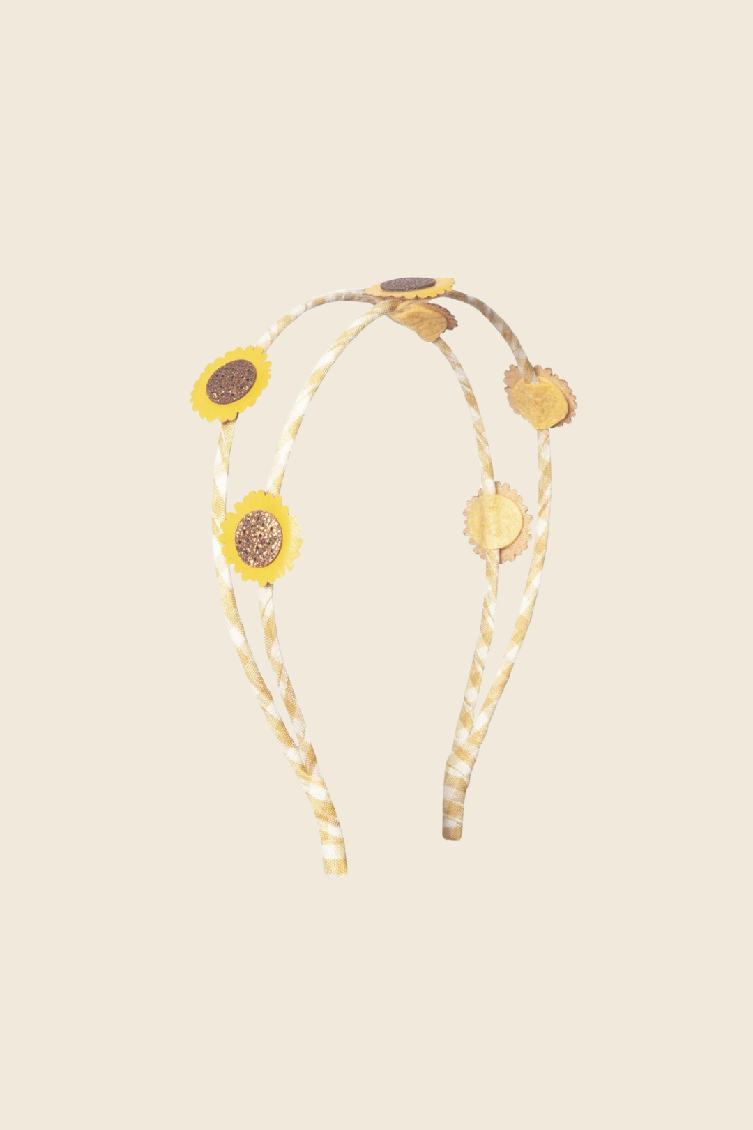 This sunflower double headband features two bands of beautiful sunflowers, perfect for those summer adventures! Wrapped in gingham ribbon, this headband is designed to provide a comfortable fit for little heads.